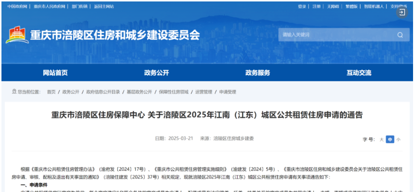 2025年涪陵江南(江东)城区公共租赁住房3月25日开始申请