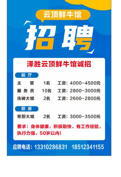 云顶鲜牛馆诚招 前厅主管1名 服务员10名 帮厨大姐2