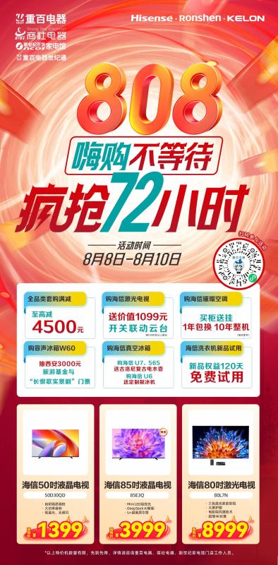8.8-8.10 重百amp海信容声科龙 嗨购不等待 疯抢72小时 全品类套购满额至高减4500元