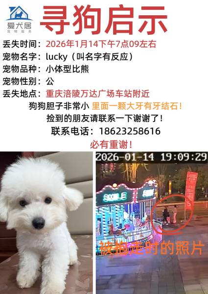 狗狗回家 #比熊走丢重庆涪陵万达广场 2026 1月14号下午7点09左右在公交车站附近走丢监控里