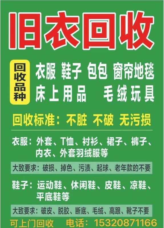 高价上门回收各种废品 衣物类:旧衣、床上用品、包包、鞋子等。 纸品塑料类:纸皮、旧书、塑料瓶等。 金属类:废铁、废铜,不锈钢,吕,等各类废旧金属等。 交通工具:报废小车、报废摩托、报废三轮车,报废电瓶车,报废农耕机械等。 家电家具:空调、冰箱、洗衣机、热水器、麻将机、手机、平板、电脑等。 厂房拆除、公司招投标业务 ☎️15320871166,24小时来电必应!