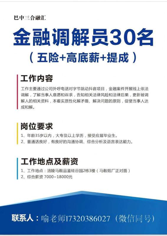 招聘综合文员,薪资面议,工作地在涪陵,学历不限,工作年限不限。 工作内容:负责公司各类文件资料的整理